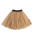 Feminine with an edge layered tulle skirt in a beige "mocha" color with a black elastic waistband with nununu logo repeating. Pair with a cool tee for making everyday special or a fancier top for a dressier occasion.