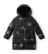 Cool and cozy winter down jacket. Features gray star pattern, large hood, front zip pocket, inner shoulder straps and a silver zip closure. Super warm and stylish.