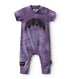 Cool purple tie dyed short sleeve jumper with a rock n roll vibe. Features brand name in black on the chest, raw edged sleeves and button snaps on the left shoulder and between the legs for easy dressing.