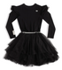Feminine & edgy all black tutu dress. On top, it’s a long sleeve t-shirt with shoulder ruffles featuring tufts of tulle for a bit of volume. On the bottom there are layers & layers of black tulle that cascade in a dark cloud of gothic glam. A pretty design detail is the shiny sequin elastic waist & embroidered crown at left chest.