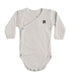 Unisex envelope style bodysuit in natural with small patch at left chest. Features button snap closures for easy dressing and diaper changes.