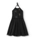 Chic halter dress with a drawstring tie collar, tone on tone star print on top, sequin waistband and tulle skirt.