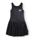 this dress is as ready to dance as your little one. it’s a black heavy single cotton sleeveless number with a little bit of a wash to it and a seam around the waist for total twirlability. it says c.f on the chest in white sporty print which obviously stands for control freak.
