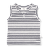 Cute tank top. Features rounded neck and arm holes with decorative overlock stitch trim detail. Stretch cotton fabric has midnight blue thin stripes on a heather grey background. Pair with our Marsala Bloomer for a full outfit.
