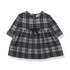 Cozy fleece lined plaid dress. Features rounded neck, rolled cuff at wrist, grey tie bow at waist and brown button closures down the back.