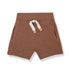 Comfy brown shorts. Features two side pockets, natural colored waist tie with leather finishes and elastic waist for easy dressing.