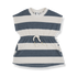 Striped terry dress. Features ribbed crew neck, keyhole button closure at back, side pockets, cinched elastic waist with decorative rope tie and allover blue-gray stripes.