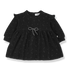 Cozy fleece lined dress. Features rounded neck with small ruffle detail at shoulder, grey tie bow at waist, brown button closures down the back, allover gray scatter print and stitched raw hem.