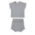 Soft ribbed set. Top features short sleeves and two wood-look buttons on each shoulder for easy dressing. Bloomers feature fold over waist band and ribbed stretch leg openings for comfort. Add this coordinating bib and swaddle for a perfect baby gift. Made in Spain of 47% cotton, 48% modal and 5% elastane.