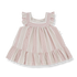 Airy striped dress in natural pink an taupe. Features flutter sleeves, square neckline, button closures down the back and ruffle hem.