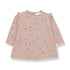Sweet dusty pink a-line baby dress with tiny leaf print. Features ruffle trim shoulders, two tiny pockets on front and keyhole button closure at back with button snap.