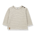 Soft striped tee. Features rounded neck with brown button details on shoulder, cute leather look logo detail on the hem and thin grey stripes on a beige background.