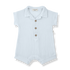 Soft cotton muslin romper. Features lapel collar, ribbed trim at sleeves and legs, wood button front closure and snap closure at the bottom for easy dressing.