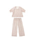 Feminine vintage feel PJ set with a stripes print. Features short sleeve top with rounded collar, puff sleeves and button front along with coordinating relaxed fit pants.