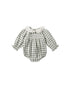 Adorable checked romper with a sweet embroidered collar. Features a smocked front, and gathered long sleeves. Buttons at the back and snaps at the bottom make for easy dressing.