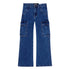 These blue denim trousers are made from organic cotton and have a flared silhouette with front and back pockets. The waist has belt loops, button and zip fastening, and an adjustable elastic inside for a comfortable fit. Additionally, the trousers have large cargo pockets on the sides and back pockets.