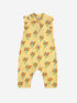Adorable soft yellow playsuit with an all over floral "firework" print. Features feminine ruffle trim collar, sleeveless arms with a ruffle trim, buttons closures on the front and button snaps between the legs for easy changes.