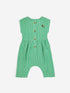 Cute green gingham jumper with a sweet little bird embroidery at left chest. Features short sleeves, front button closures, gathered waist, roomy fit and button snaps at the bottom for easy dressing. Made from 84% cotton 16% linen. Made in India