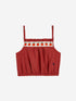 Pretty woven top with a colorful tomato trim on the top. Features subtle ribbed texture, ruffle trim at collar, elasticized waist and adjustable straps. Embroidered blue "BC" on the bottom of the shirt.