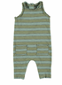Cool striped tank jumpsuit in blue and green wide stripes. Features raw edges along neck, arms and pocket detials at front, three wooden button opening at back and button snap closures between the legs for easy dressing.