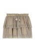 Pretty two tier short skirt in a subtle metallic gold color. Features a gathred waist with gold band and tire front with tassels. Pair withe the coordinating Tubi blouse for a chic look.