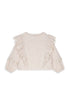 Pretty, vintage style top in subtle blush stripes. Features a round neck, two scalloped and embroidered ruffles down the front, puff sleeves with elasticized wrists. Pair with this gold skirt for a chic look.