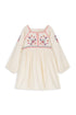 Pretty cream colored dress with colorful embroidery. Features subtle square neckline, elasticized wrists, gathering under the chest for added volume through the body and double cotton gauze fabric.