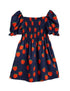 Blue woven dress with an all over Strawberries print, made from 100 % TENCEL™ Lyocell. The fabric is soft and airy, perfect for summer days. Designed with an elastic smock around the chest along with puffed and frilled sleeves.