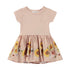 Adorable pink baby dress in two fabrics. It has short sleeves and a peplum with a floral print.