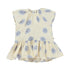 Airy woven cotton baby dress in white with blue smiley faces. Features short raglan sleeves, gathered neck, drop waist and snap closure at the back. Made from 100% cotton.