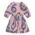 Pink dress in organic cotton, knee-length with a round neckline, three-quarter length sleeves with elastic at the wrists, and a wide elastic waistband that adds gathers. The dress is easy to put on with the invisible zipper located at the back. The print on the dress consists of floating rainbows that take the shape of smiling faces.
