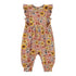 Adorable sleeveless baby romper with ruffle edges along the shoulders and a cute floral print. Features easy snap closure at the back and between the legs.