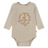 95% organic cotton onesie in beige with a print of a peace sign in flowers. A simple, minimalist piece for everyday wear. Features button snaps at shoulder and bottom for easy dressing.