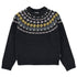 Black knit jumper with a pattern that runs over the front and back shoulders like traditional nordic knitting patterns. The design is of hearts, peace signs and smiley faces in different colours. This jumper is in a soft wool/acrylic blend. It has a round neck with rib and long sleeves and the bottom, also with rib. The jumper is in a regular fit.