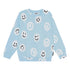 Soft light blue crewneck sweatshirt. Features ribbed neck, cuffs and hem in an allover graffiti style print of smiley faces and peace signs. Pair with the matching shorts for a cute set.