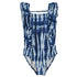 Pretty blue tie dye print one piece with ruffle trim down front and along deep scoop back. Features a thin strap at top of back to keep straps in place. Molo swimwear has a 50+ UV protection. It is recycled & made from REPREVE reusable polyester which is made from used plastic bottles and other waste.