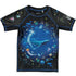 Black rash guard with a placement print on the front and short t-shirt sleeves. It has a Molo Swim logo on one of the sleeves. The print is of a dark ocean with glowing plankton and jellyfish. It has a large, illuminated humpback whale. It is constructed in recycled polyester and is in a lightweight, comfortable fit that's easy to pull on over the head. The top offers a high level of 50+ UV protection from the sun.
