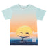T-shirt in 100% organic cotton with a placement print in shades of blue and orange. The print is of a sunset over the ocean, where a whale's tail forms a smiling face with the help of two playful dolphins. The print continues on the back and has a humpback whale throwing itself into waves. The t-shirt has a round neck with a rib edge and is in a regular fit.