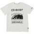 Cool black and white tee featuring a world graphic and the text "Co-exist" and "Mis casa es su casa" and last on a grid background "One World."