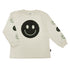 Cool off white t-shirt with a print in black and green of a classic smiley face icon that gets a different, funny expression when a glitch on the screen causes its eyes to flicker like a digital gleam in its eye. Features a rounded neck with a ribbed edges, long sleeves, and a loose fit. Made from 100% organic cotton.