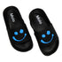 Black slide sandals with happy, blue smiling faces on the front. The sandals are waterproof, so they are perfect to bring to the pool or to the beach.