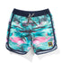Tropical beach printed board shorts. Features an elasticized waist, signature black and white drawstring and small logo patch at bottom of left leg. Made from 100% recycled polyester microfiber.
