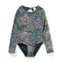 All over pebble camo print long sleeve swimsuit. Features a back tie for easy dressing.
