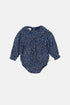 Pretty woven romper with a navy background and all over multicolor mosaic pattern. Features a ruffle around the necklin, gathered upper for a puffed effect, elasticized cuffs and leg holes. Buttons at back and bottom. Made from 100% viscose.
