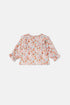 Pretty gauze wrinkle effect blouse with and all over tiny floral print. Features a round neck, long sleeves, ruffle trimmed shoulders, elasticized wrists and buttons at back. Pair with these sweet bloomers for a cute set. Made from
