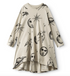 Loose fit 360 a line dress in "smokey natural" featuring and all over black tattoo inspired print. Long sleeve dress features a diagonal center seam and slightly longer length at back.