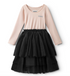 Cool and feminine two tone dress in nude and black with a small bubble logo at left chest. Features a stretchy lycra top, black sequin waistband and voluminous layered skirt in tulle & cotton.