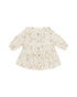 Soft baby dress in an adorable all over unicorns print. Features a tiered skirt, long sleeves, and cute ruffled collar along the neck. Features coconut button down the front. All baby sizes includes gathered bloomers.