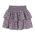 Feminine floral skirt. Features smocked stretch waistband with ruffle trim and two tiered ruffle layers on a navy background. Add the matching headband >