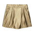 Statement gold faux leather mini skirt with zip closure on the back and side pockets. Pair with this gathered sleeve top for a chic look.